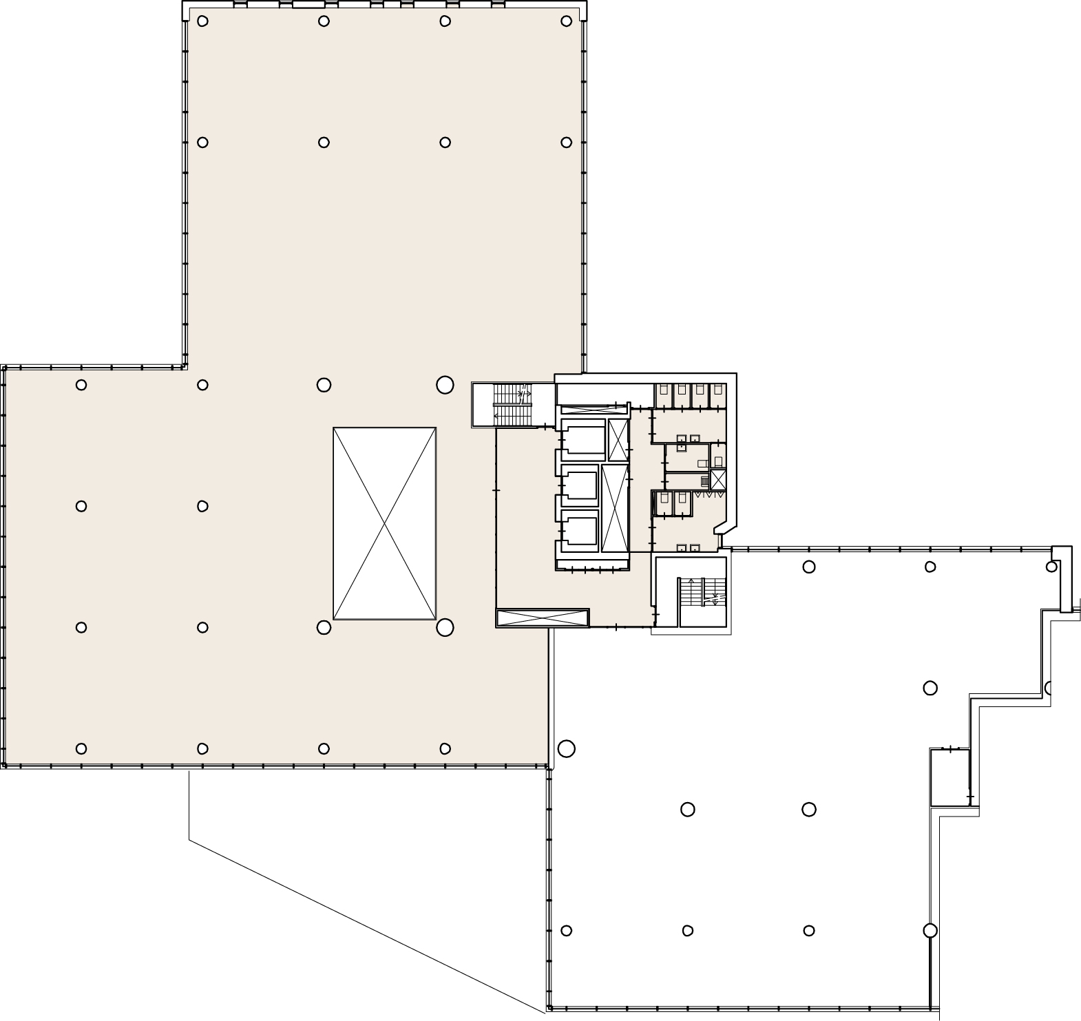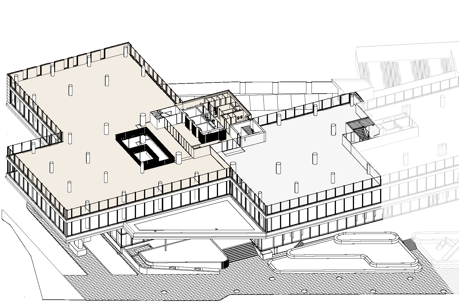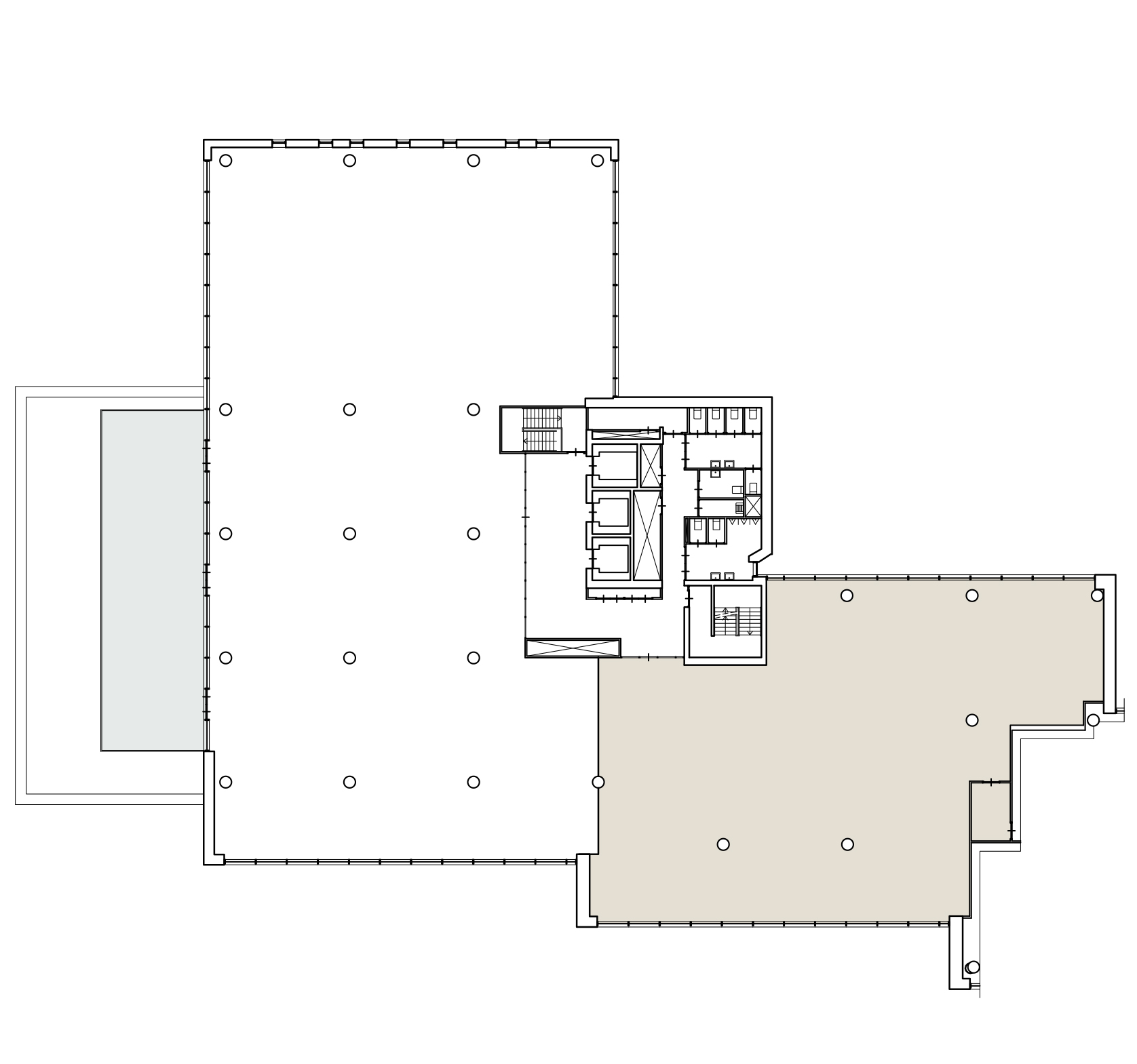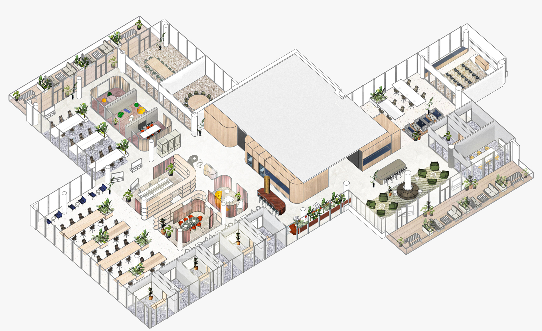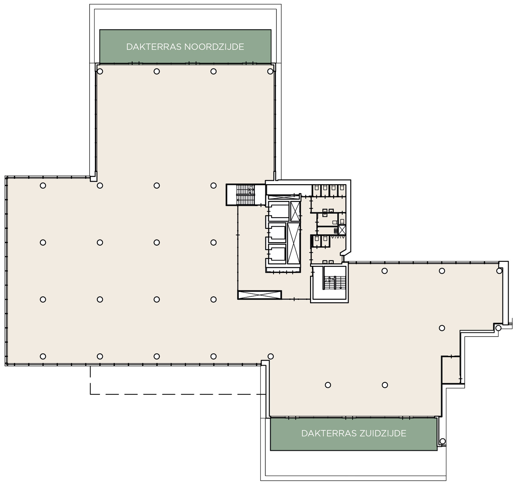 In deze ‘open space’ test-fit is ruimte voor 56 flexibelle werkplekken, 5 vergaderruimtes, 6 meeting boxes, 1 congresruimte, diverse loungeplekken en 2 ruime dakterrassen.