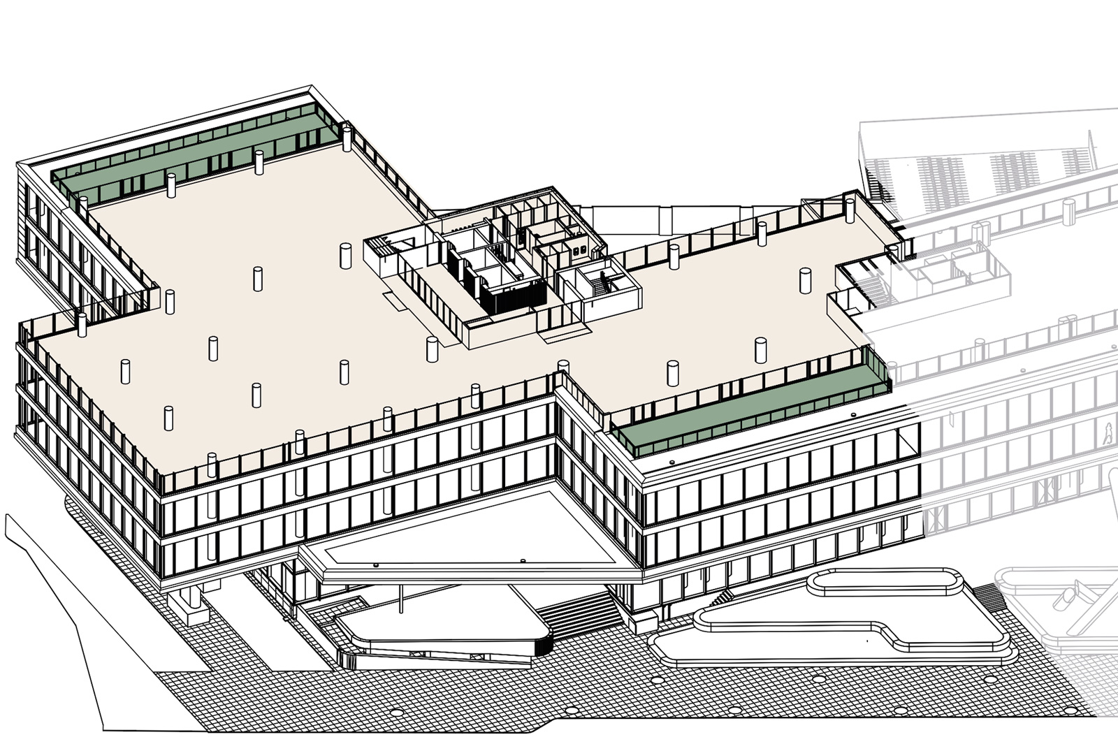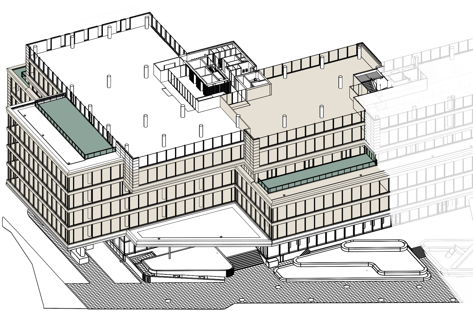 De stijlvolle transparante gevel en de grote, flexibel in te richten kantoorvloeren creëren een zeer ruimtelijke gevoel. Er is veel natuurlijke lichtinval en vanaf de vele dakterrassen zijn uitzichten fantastisch.