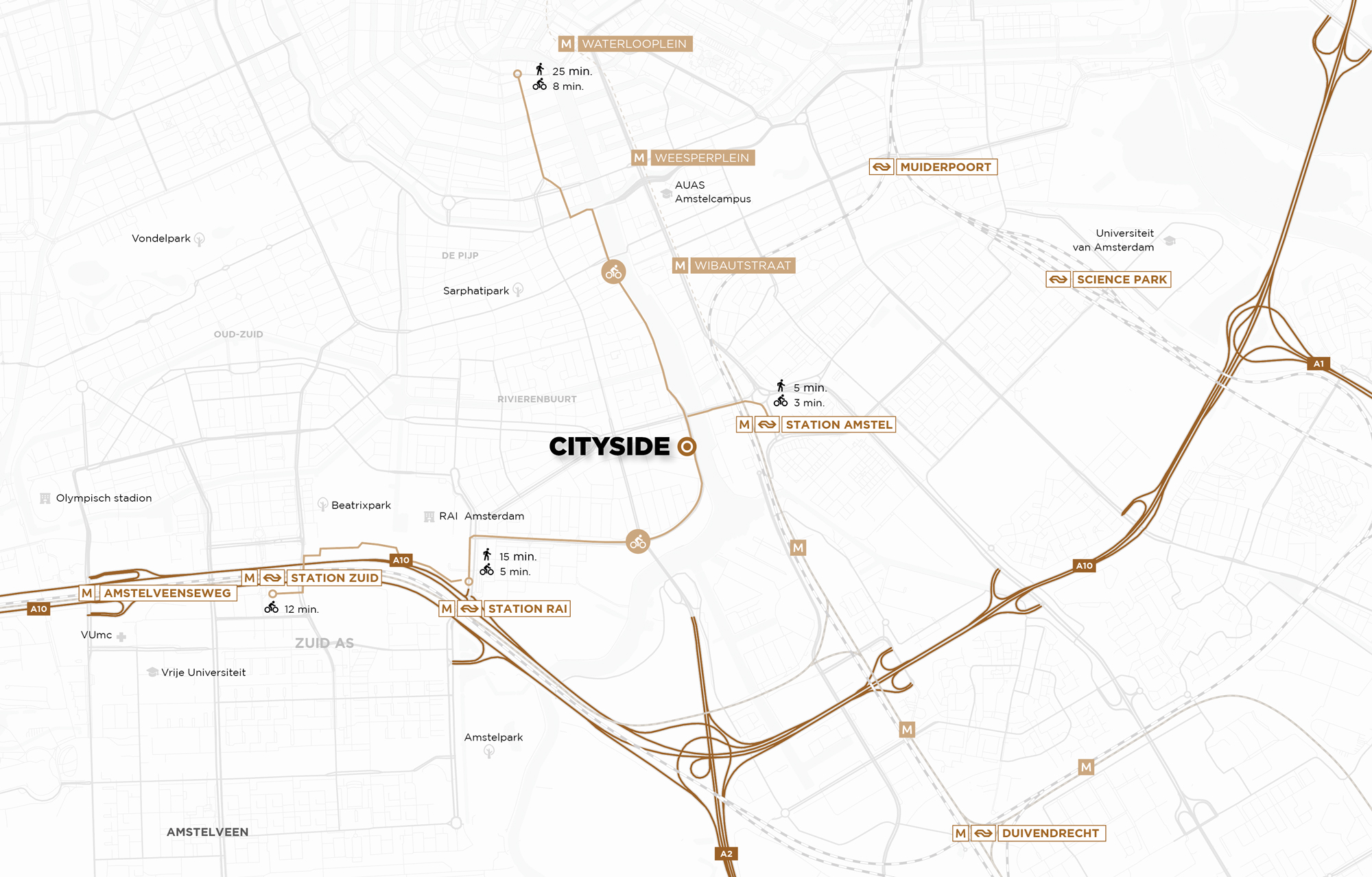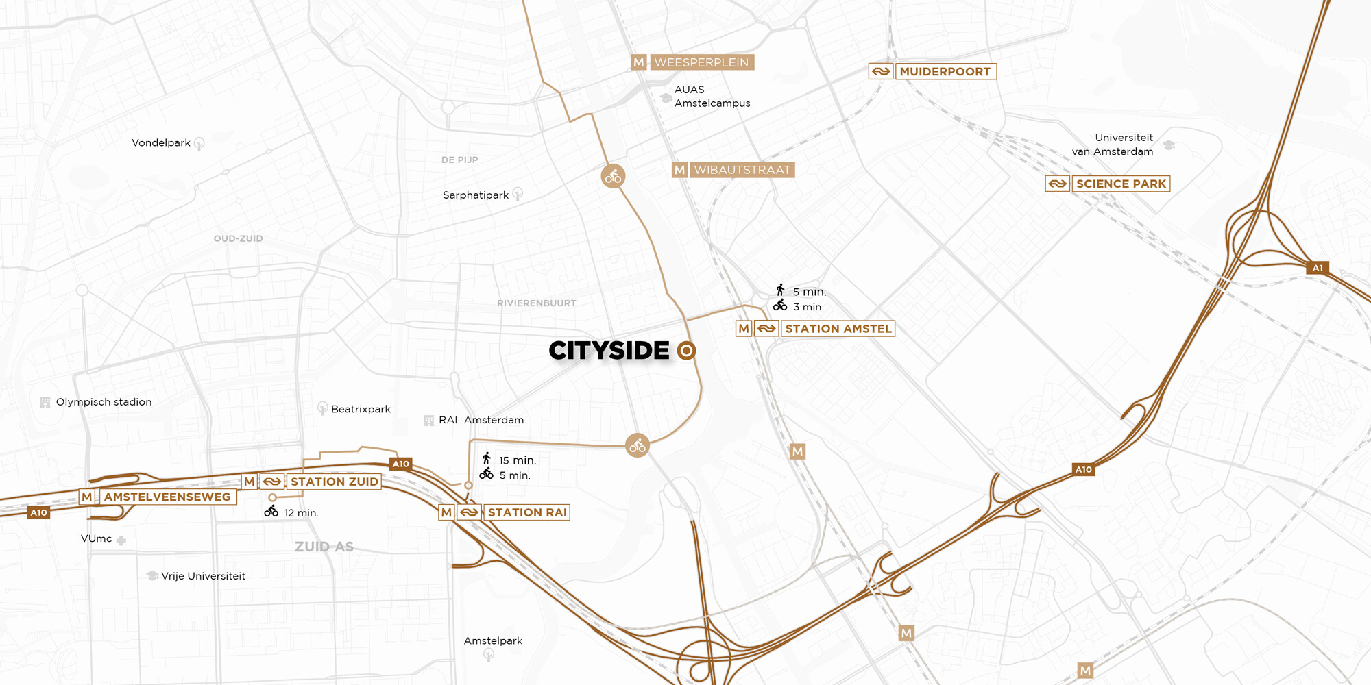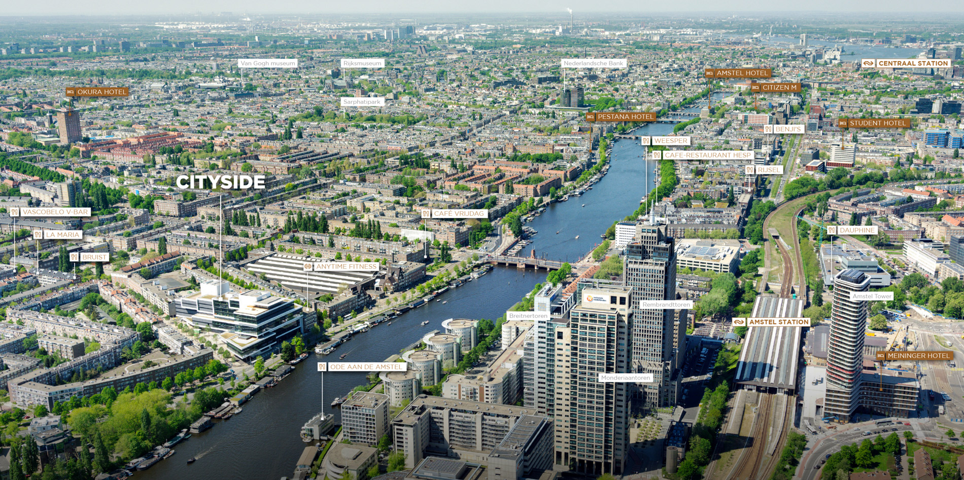 Het moderne, strakke ontwerp laat CitySide uitblinken in de omgeving. Direct aan de Amstel, in de nabijheid van Zuidas en op slechts enkele minuten van het bruisende centrum van Amsterdam.
