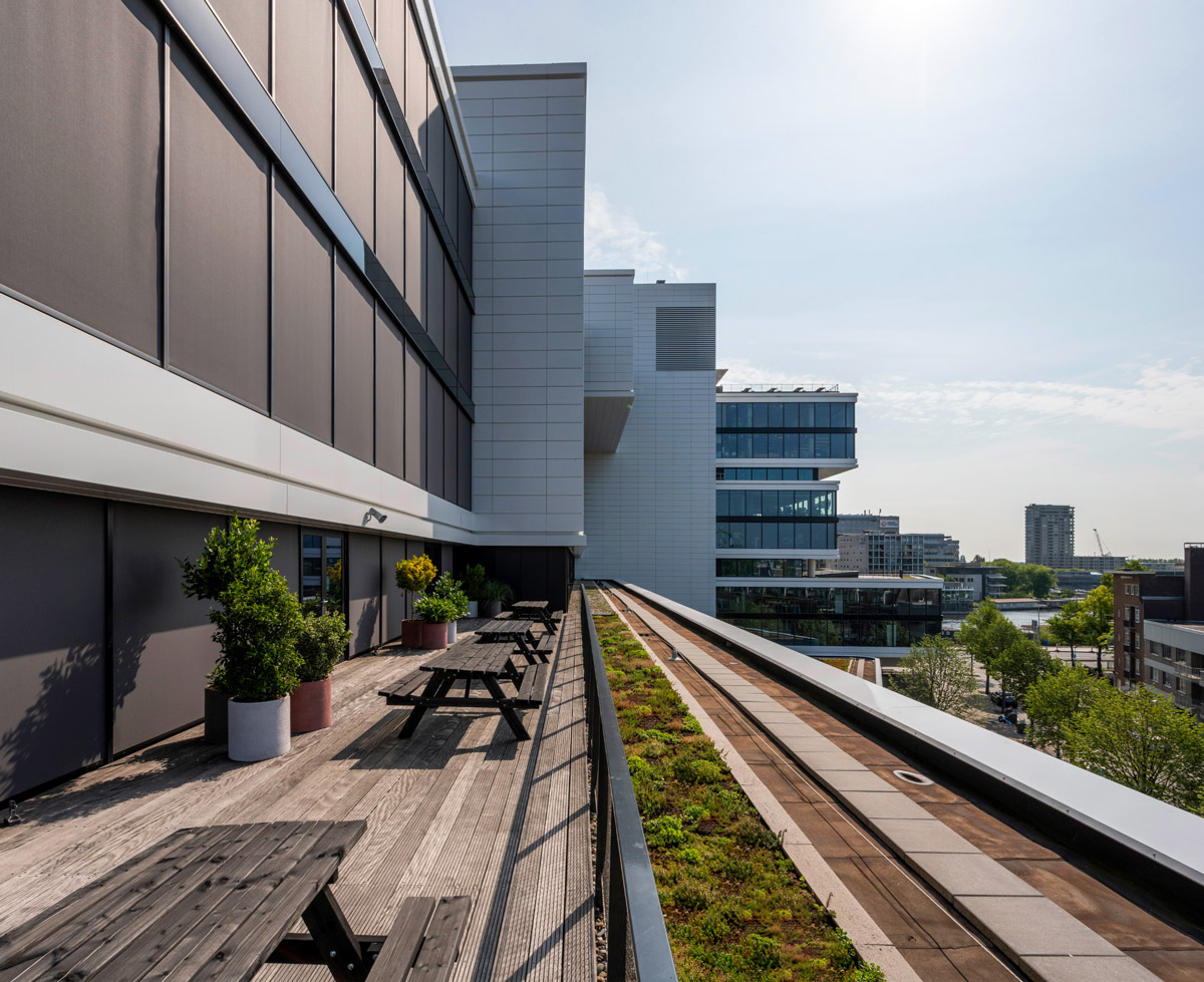De dakterrassen aan het Amsteldok bieden een adembenemend panoramisch uitzicht over de stad en de Amstel en vormen een indrukwekkend decor voor elke zakelijke gelegenheid. Deze terrassen zijn zorgvuldig ontworpen om esthetiek te combineren met functionaliteit, wat zorgt voor een productieve en plezierige ervaring voor bezoekers.