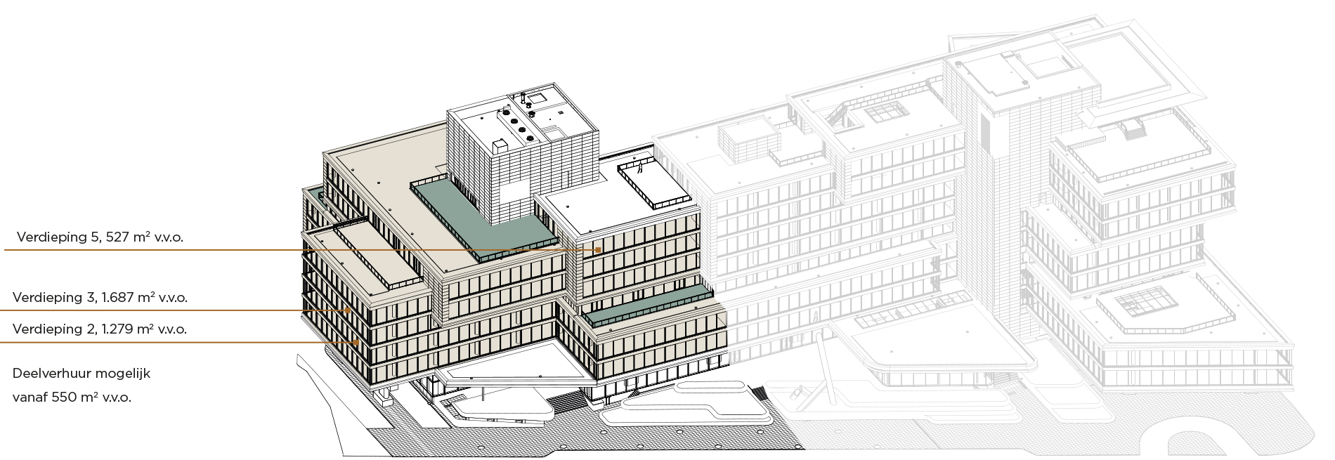 Op de 2e, 3e en 5e verdieping is ca. 3.493 m2 v.v.o. beschikbaar.